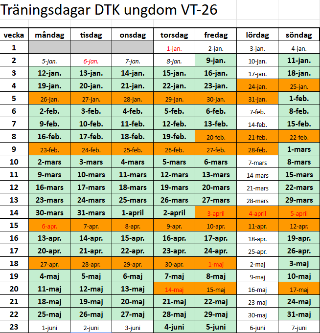 OBSERERA! INGEN ORDINARIE TRÄNING PÅ HELGDAGAR, EX LÅNGFREDAG, PÅSKDAGEN, ANNANDAGPÅSK, 1:A MAJ SAMT 6:E JUNI.